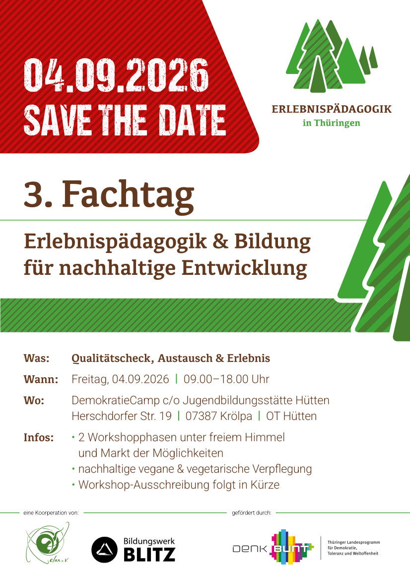 Liebe Netzwerkpartner*innen, liebe Kolleg*innen, liebe Kund*innen, liebe Interessierte, der ELAN e. V. aus Erfurt und der BLITZ e. V. aus Hütten veranstalten am 04.09.2026 den 3. erlebnispädagogischen Fachtag. Neben zwei Workshop-Slots wird es auch einen Markt der Möglichkeiten geben, wo (...)